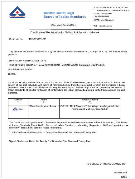 Shri Radha Krishna Jewellers is officially registered under the Government of India’s MSME (Micro, Small & Medium Enterprises) scheme, as reflected in our Udyam Registration Certificate. With the enterprise classified as a Micro Trading Unit, this certification confirms our legitimacy, operational transparency, and compliance with government standards. It strengthens our position as a trusted business committed to providing genuine and high-quality jewellery.