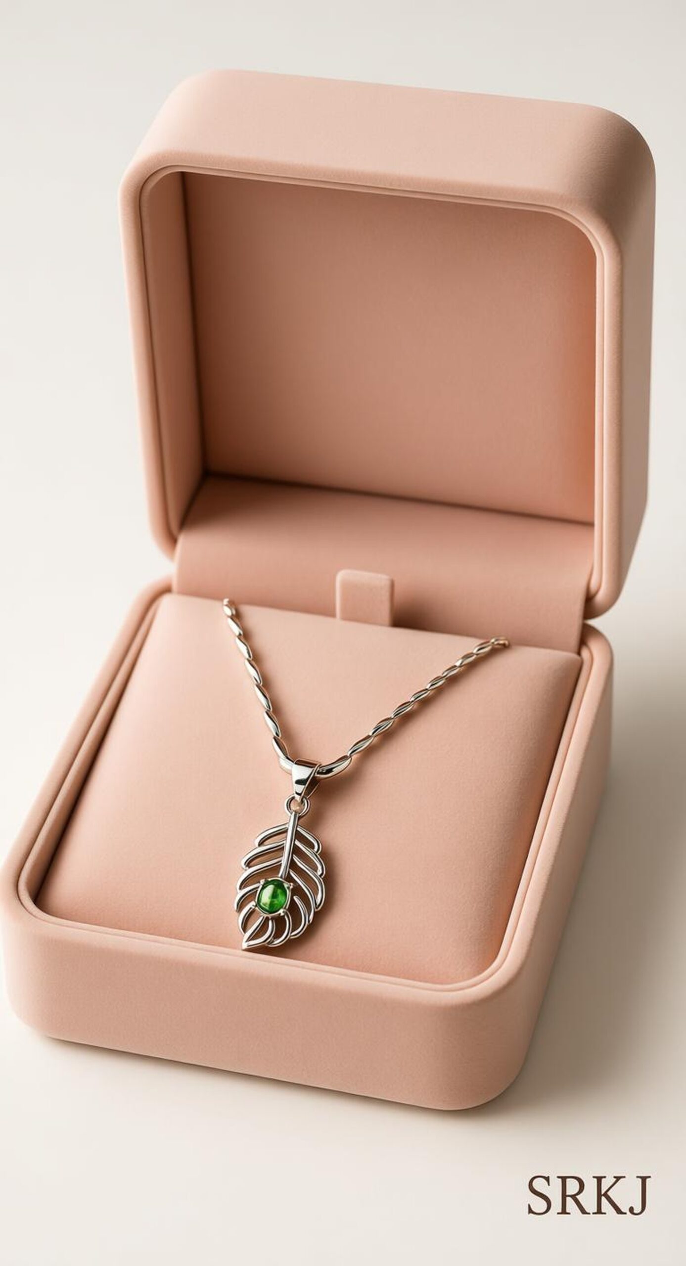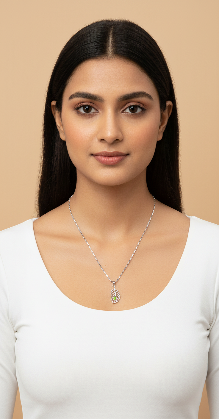 Add a touch of divine elegance to your jewellery collection with this beautifully crafted 92.5 Sterling Silver Peacock Feather Pendant with Chain. Inspired by the sacred peacock feather associated with Lord Krishna, this pendant symbolizes purity, grace, and positivity. The finely detailed feather design is enhanced with a vibrant green stone at the center, giving it a graceful and eye-catching appeal.