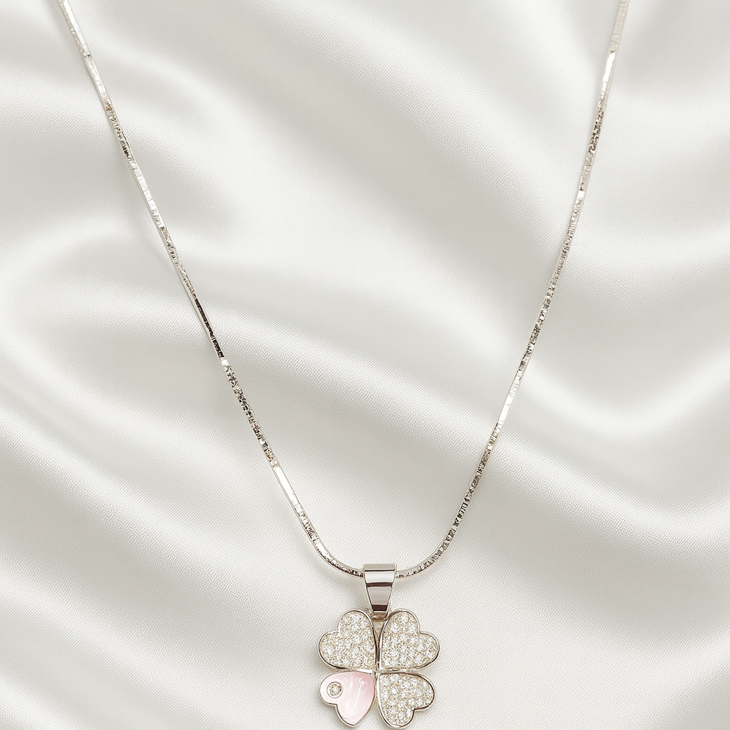 Add a touch of elegance and good fortune to your style with this beautifully crafted 92.5 Sterling Silver Four-Leaf Clover Pendant with Chain. Designed with sparkling Cubic Zirconia stones and a soft pastel enamel accent, this pendant represents luck, love, faith, and positivity. The high-quality sterling silver chain and anti-tarnish polish ensure long-lasting shine and comfortable daily wear.