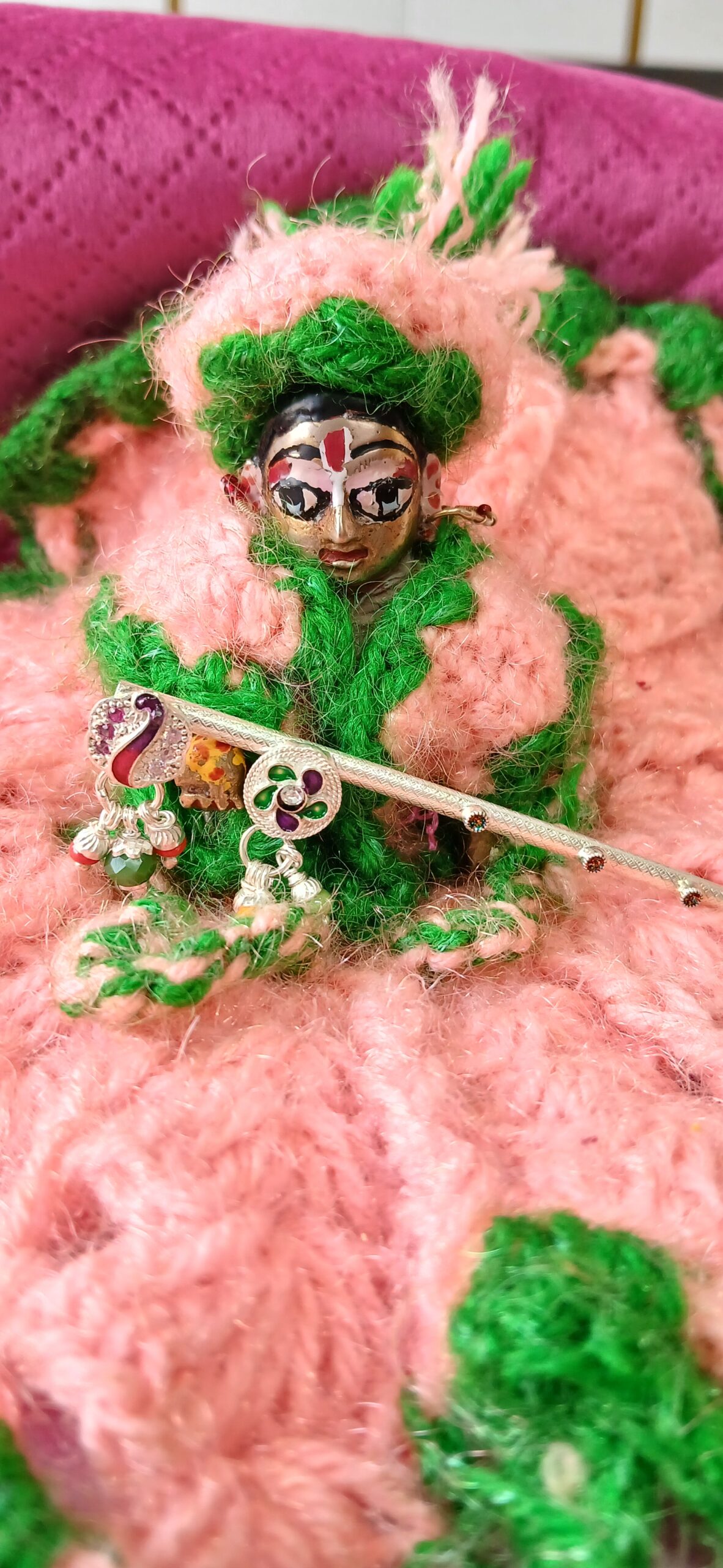 Beautifully handcrafted with multicolor enamel work and delicate hanging beads, this silver flute adds a vibrant, devotional charm to Laddu Gopal Ji’s shringar. Ideal for daily pooja, Janmashtami, and festive temple adornment.