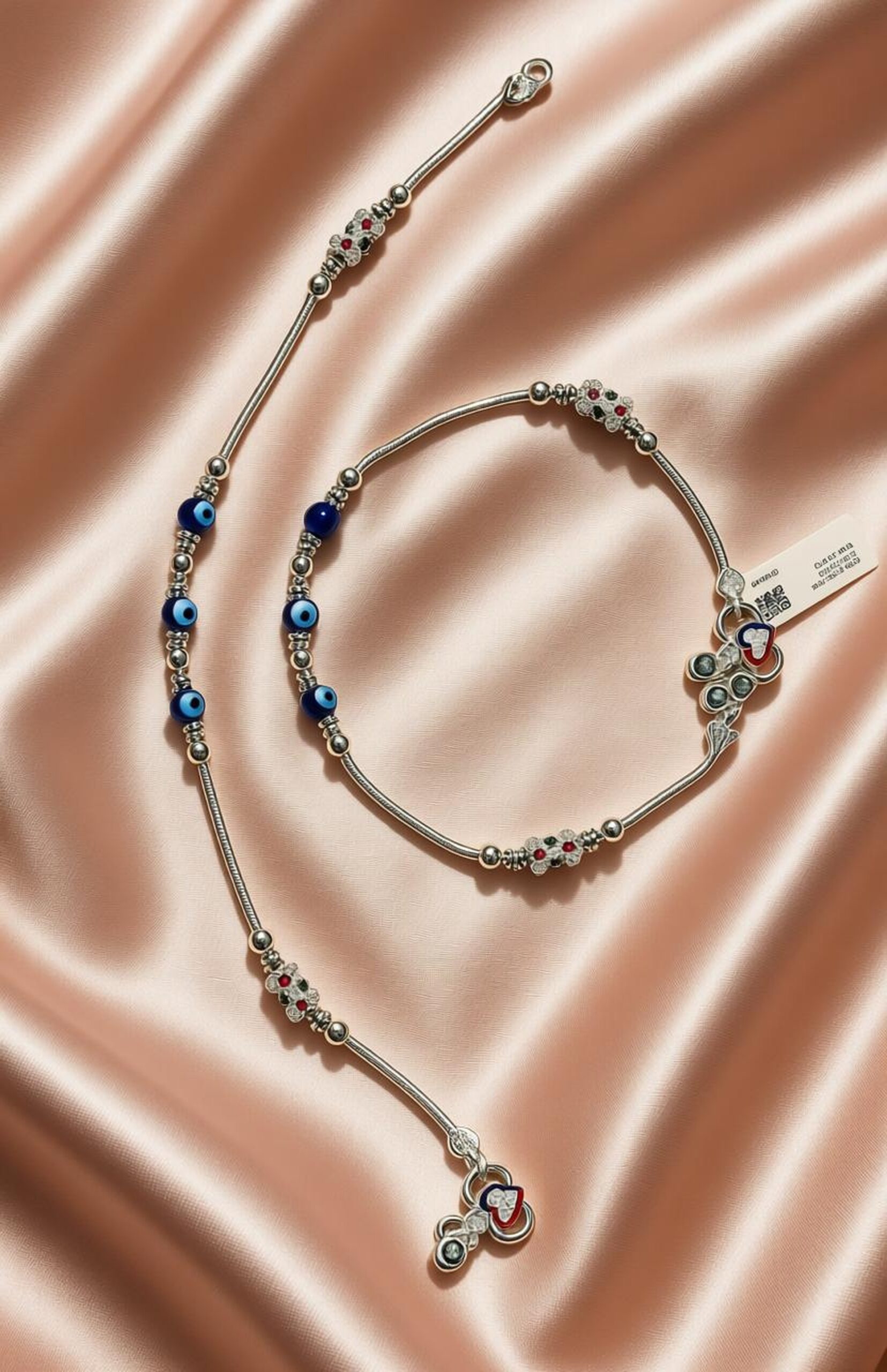 This elegant Silver Payal is designed to bring together style, tradition, and protection. Featuring stunning blue evil eye beads combined with finely polished silver elements, it not only enhances your look but also symbolizes protection from negative energies.